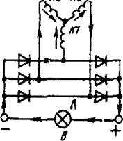Визначення ЕРС батареї без навантаження проводиться пробником при вимкнених навантажувальних опорах або вольтметром зі шкалою на 30 В і ціною поділки 0,2 В з дотриманням полярності. Для забезпечення необхідної точності вимірювання проводиться приблизно через 1 год. після зарядка (або припинення руху автомобіля) при температурі електроліту 15 – 30° С. За величині ЕРС можна судити про зарядку батареї — зменшення ЕРС батареї на 0,01 В відповідає зниженню її зарядки приблизно на 1%. Генератор служить для живлення струмом всіх споживачів струму і для зарядження акумуляторної батареї при середній і великій частоті обертання колінчастого вала двигуна. На автомобілях, які вивчаються, встановлюються трифазні генератори змінного струму з випрямлячами на кремнієвих діодах. Принципова схема роботи трифазного генератора змінного струму показана на рис. 3. На сталевому статорі 1 (рис. 3, а) із внутрішньої сторони під кутом 120° розташовані три котушки К1, К2 і КЗ з обмотками, які між собою з'єднуються зіркою, тобто одні кінці обмоток котушок з'єднуються в одну точку 0, а інші виводяться в загальне коло споживачів (Л1, Л2 і ЛЗ). Котушка з ввімкненим в неї споживачем утворить фазу. Всередині статора обертається магнітний ротор 2. При обертанні ротора до котушок за кожні 120° поперемінно підходять північний і південний полюси. При цьому обмотки котушок статора перетинаються магнітними лініями, в яких індукується змінна за напрямком ЕРС, що створює змінний струм в колі кожної фази. Магнітний потік (показаний на рис. 3, а переривчастими стрілками) замикається через корпус 1 статора. При цьому струм, утворений в одній будь-якій фазі, обов'язково проходить в коло двох інших фаз. За один оберт ротора через рівні проміжки часу в кожному колі фази змінюється напрямок струму в залежності від кількості пар полюсів і частоти обертання ротора. Однак змінний струм не може бути використаний для зарядження акумуляторної батареї, тому в генераторі встановлений блок випрямлячів, який складається із шести кремнієвих діодів, що перетворюють змінний струм в постійний (діодом називають двоелектродний напівпровідниковий пристрій, що проводить струм тільки в одному напрямку). Кремнієві діоди мають великий термін служби, пропускають дуже малий зворотний струм, надійно працюють в широкому діапазоні температур (від — 60 до + 125°С), а також мають малі габарити і масу, що дозволяє встановити їх в кришці генератора автомобіля.