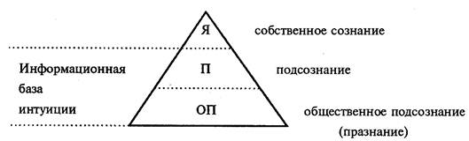 Интуиция в менеджменте означает способ выбора решения без аргументированного доказательства на основе предшествующего опыта и «внутреннего голоса». Этот тип решений широко распространен в практике управления. Можно ли развить в себе «шестое чувство», так необходимое руководителю в условиях, когда риск постоянно сопровождает хозяйственную деятельность? Для. ответа на этот вопрос рассмотрим механизм интуитивного мышления. По мнению немецкого специалиста И. Энкельмана, структуру нашего сознания условно можно представить, как психологический треугольник, состоящий из 3-х уровней: