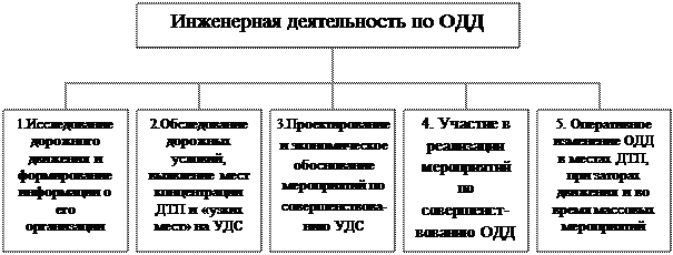 Рис. 8. Структура деятельности по обеспечению безопасности дорожного движения 1. Основой «для разработки мероприятий по ОДД является информация о состоянии существующей организации движения и данные об интенсивности, составе транспортных и пешеходных потоков, другая информация о дорожном движении. Такую Информацию обычно собирает организация (проектная, дорожно-эксплуатационная, коммунальная), которой поручено разработать комплекс мер по совершенствованию организации движения. Эту информацию собирают в процессе периодических обследований УДС и дорожного движения. 2. Работа по выявлению мест концентрации ДТП на существующей УДС, мест с ограниченной пропускной способностью, участков, где наблюдаются задержки транспортных и пешеходных потоков, базируется на данных статистики ДТП, сведениях ГИБДД о нарушениях Правил дорожного движения Российской Федерации, оценке пропускной способности отдельных элементов УДС, результатах изучения условий движения с помощью ходовых лабораторий. В плане выявления опасных мест эту работу должны систематически выполнять подразделения ГИБДД, обслуживающие данную городскую территорию или дорогу. Изучение "узких" мест и оценку пропускной способности могут проводить как сотрудники ГИБДД, так и организация, которой поручена разработка предложений (проектов) по совершенствованию дорожного движения. 3. На основе информации о состоянии УДС, ОДД, данных о ДТП и местах их концентрации, наличии "узких" мест разрабатываются (с необходимым экономическим обоснованием) проекты организации дорожного движения (ПОД). В зависимости от поставленной задачи проект разрабатывается для локального участка (перекресток, участок улицы) либо для города (городского района), автомобильной дороги или городской магистрали в целом. Исполнителем при разработке проекта может быть только специализированная проектная организация. Задание на проектирование, как правило, должно разрабатывать соответствующее подразделение местной администрации при участии подразделения ГИБДД, обслуживающего данную территорию или дорогу. 4. Непосредственное участие в реализации разработанных мероприятий по совершенствованию организации движения, осуществляемое в порядке авторского надзора, дает возможность корректировать при необходимости проектные решения и одновременно с этим проверять их на практике. Разработка и реализация любых мероприятий по организации движения подразумевают наличие определенных правил, регламентирующих поведение всех участников дорожного движения. Поэтому Правила дорожного движения РФ принято считать основой организации дорожного движения. Дорожные знаки и разметка, светофорная сигнализация являются дополнительными и весьма важными инструментами, с помощью которых обеспечивается оптимальная организация движения. 5. Оперативные изменения организации дорожного движения необходимы при проведении массовых мероприятий (митингов, демонстраций, спортивных соревнований, праздничных шествий), а также в случае возникновения на отдельных участках УДС заторов (исчерпание пропускной способности), в местах ДТП, при проведении аварийно-спасательных работ. Как правило, места проведения массовых мероприятий заранее известны, и поэтому службы организации движения должны иметь проработанные и сог