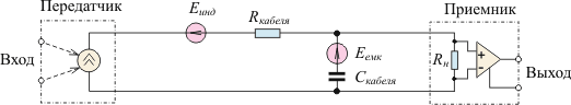 Для управления потоком данных (Flow Control) могут использоваться два варианта протокола — аппаратный и программный. Аппаратный протокол управления потоком RTS/CTS (Hardware Flow Control) использует сигнал CTS, который останавливает передачу данных, если приемник не готов к их приему. Передатчик «выпускает» очередной байт только при включенной линии CTS. Байт, который уже начал передаваться, задержать сигналом CTS невозможно (это гарантирует целостность посылки). Программный протокол управления потоком XON/XOFF используется при дуплексном канале передачи данных. Работает протокол следующим образом: если приемник не может далее принимать данные, то он по обратному последовательному каналу, посылает байт-символ XOFF (13h). Передатчик, приняв этот символ, приостанавливает передачу. Когда принимающее устройство снова становится готовым к приему данных, оно посылает символ XON (llh), приняв который передатчик возобновляет работу. Время реакции передатчика на изменение состояния приемника по сравнению с аппаратным протоколом увеличивается, по крайней мере на время передачи символа (XON или XOFF) плюс время реакции программы передатчика на прием символа. Интерфейс «токовая петля» Распространенным вариантом последовательного интерфейса является токовая петля (рисунок 4.11). В ней электрическим сигналом является не уровень напряжения относительно общего провода, а ток в двухпроводной линии, соединяющей приемник и передатчик. Интерфейс "токовая петля" используется для передачи информации с 1950-х годов. Первоначально в нем использовался ток 60 мА позже, с 1962 года, получил распространение интерфейс с током 20 мА, преимущественно в телетайпных аппаратах. В 1980-х годах начала широко применяться "токовая петля" 4...20 мА в разнообразном технологическом оборудовании, датчиках и исполнительных устройствах средств автоматики. Популярность "токовой петли" начала падать после появления стандарта на интерфейс RS-485 (1983 г.) и в настоящее время в новом оборудовании она практически не применяется. В передатчике "токовой петли" используется не источник напряжения, а источник тока. По определению, ток, вытекающий из источника тока, не зависит от параметров нагрузки. Поэтому в "токовой петле" протекает ток, не зависящий от сопротивления кабеля Rкабеля, сопротивления нагрузки Rн и э. д. с. индуктивной помехи Еинд, а также от напряжения питания источника тока Еп. Ток в петле может измениться только вследствие утечек кабеля, которые очень малы. Это свойство токовой петли является основным и определяет все варианты ее применения. Емкостная наводка Еемк, э. д. с. которой приложена источнику тока, не может быть ослаблена в "токовой петле" и для ее подавления следует использовать экранирование.