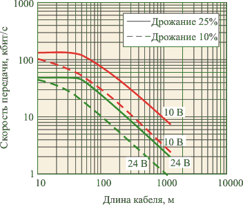 В качестве линии передачи обычно используется экранированная витая пара, которая совместно с дифференциальным приемником позволяет ослабить индуктивную и синфазную помеху. На приемном конце ток петли преобразуется в напряжение с помощью калиброванного сопротивления Rн. При токе 20 мА для получения стандартного напряжения 2,5 В, 5 В или 10 В используют резистор сопротивлением 125 Ом, 250 Ом или 500 Ом соответственно. Основным недостатком "токовой петли" является ее принципиально низкое быстродействие, которое ограничивается скоростью заряда емкости кабеля Скабеля от источника тока. Например, при типовой погонной емкости кабеля 75 пФ/м и длине 1 км емкость кабеля составит 75 нФ. Для заряда такой емкости от источника тока 20 мА до напряжения 5 В необходимо время 19 мкс, что соответствует скорости передачи около 9 кбит/с. На рисунке 4.12- приведены зависимости максимальной скорости передачи от длины кабеля при разных уровнях искажений (дрожания).