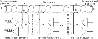 Количество и тип соединяемых устройств Подключение устройств Схема подключения На рисунке 2.12 изображена локальная сеть на основе интерфейса RS −485, объединяющая несколько приемо-передатчиков. При подключении следует правильно присоединить сигнальные цепи, обычно называемые А и В. Переполюсовка не страшна, но устройство работать не будет. Количество устройств, подключаемых к одной линии интерфейса, зависит от типа примененных в устройстве приемопередатчиков. Один передатчик рассчитан на управление 32 стандартными приемниками. Выпускаются приемники с входным сопротивлением 1/2, 1/4, 1/8 от стандартного. При использовании таких приемников общее число устройств может быть увеличено соответственно: 64, 128 или 256. Тип приёмопередатчиков — дифференциальный, потенциальный. Изменение входных и выходных напряжений на линиях A и B: Ua (Ub) от −7В до +12В (+7В).