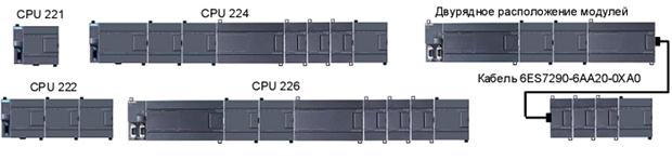 Особенности семейства SIMATIC S7-200: • время выполнения 1К логических инструкций не превышает 0.37мс; • наличие скоростных счетчиков внешних событий; • наличие быстродействующих входов аппаратных прерываний; • возможность наращивания количества обслуживаемых входов-выходов; • наличие импульсных выходов (ШИМ или ЧИМ); • потенциометры аналогового задания цифровых параметров; • часы реального времени (встроенные или устанавливаемы в виде съемного модуля); • мощный набор инструкций языка программирования; • последовательный PPI-интерфейс, который может быть использован в качестве свободно программируемого порта; • функции ведущего устройства AS-интерфейса, обеспечиваемые коммуникационным модулем CP 243-2; • функции ведомого устройства PROFIBUS-DP, обеспечиваемые коммуникационным модулем EM 277; • функции обмена данными через Industrial Ethernet, поддерживаемые коммуникационным процессором CP 243-1 и CP 243-1 IT; • дружественная оболочка программирования STEP 7 Micro/Win; • трехуровневая парольная защита программ пользователя; • возможность работы с устройствами человеко-машинного интерфейса. Основные характеристики: • компактный пластиковый корпус; • простое подключение внешних цепей через контакты с винтовыми зажимами с защитой всех токоведущих частей; • наличие съемных терминальных блоков, позволяющих производить замену модулей без демонтажа их внешних цепей; • монтаж на стандартную 35мм профильную шину DIN или на плоские поверхности с креплением винтами; • соединение модулей с помощью плоских кабелей, вмонтированных в каждый модуль ввода-вывода или коммуникационный модуль. Центральные процессоры снабжены встроенным блоком питания напряжением =24В для питания входных цепей контроллеров. В зависимости от модификации центрального процессора выходной ток блока питания может составлять 180, 280 или 400мА. Если мощности этих блоков питания недостаточно, то совместно с контроллерами могут быть использованы внешние источники питания семейства SITOP power. Все центральные процессоры, за исключением CPU 221, позволяют производить подключение модулей ввода-вывода. CPU 222 подключает до 2, CPU 224 и CPU 226 – до 7 модулей ввода-вывода. Модули ввода-вывода могут располагаться в два ряда. Связь между рядами выполняется интерфейсным кабелем 6ES7290-6AA20-0XA0 длиной 0.8м (рисунок 4.2).