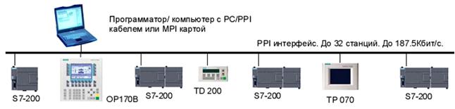 Промышленная связь Программируемые контроллеры SIMATIC S7-200 позволяют использовать для организации связи: • PPI интерфейс. Подключение через встроенный порт; • MPI интерфейс, в котором S7-200 способен выполнять только функции ведомого устройства; • AS-I (Actuator Sensor Interface), в котором контроллеры S7-200 выполняют функции ведущего сетевого устройства. Подключение через CP 243-2; • сеть PROFIBUS-DP, в которой S7-200 способны выполнять только функции ведомых DP устройств (интеллектуальных устройств распределенного ввода-вывода). Подключение через EM 277; • сеть Industrial Ethernet, в которой S7-200 способен поддерживать до 8 логических соединений и использовать для передачи данных протокол TCP/IP. Подключение через коммуникационный процессор CP 243-1 или CP 243-1 IT. Все модели центральных процессоров S7-200 оснащены встроенным PPI (Point To Point Interface) интерфейсом (RS 485), который может быть использован для подключения программатора, устройств человеко-машинного интерфейса, других контроллеров S7-200. Каналы связи выполняются витой парой. В такой сети один центральный процессор способен поддерживать связь с несколькими центральными процессорами S7-200, текстовыми дисплеями или панелями оператора. Скорость передачи данных может достигать 187.5 Кбит/с. К одному программатору, компьютеру, текстовому дисплею или панели оператора через PPI интерфейс может подключаться до 31 контроллера S7-200 (рисунок 4.4). Центральные процессоры S7-200 используют PPI интерфейс для непосредственной связи между контроллерами. Управление обменом данными выполняется с помощью инструкций NETR и NETW. PPI интерфейс может быть использован для организации связи: • с программаторами PG702, Field PG, Power PG; • через PC/PPI кабель с АТ-совместимыми компьютерами; • с текстовыми дисплеями TD200, панелью оператора TP070, а также другими панелями оператора SI-MATIC; • с другими контроллерами S7-200.
