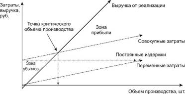 Метод, основанный на эффекте производственного (операционного) рычага[2] (CVP-анализ — «cost — volume — ptofit»)[3]. Этот метод планирования прибыли базируется на принципе разделения затрат на постоянные и переменные. С помощью этих данных рассчитывается маржинальная прибыль. Для коммерческих предприятий очень важно определить порог окупаемости затрат, после которого они начнут получать прибыль. Для этого следует использовать метод операционного (производственного) рычага, который подробно изложен в главе «Затраты предприятий». Используя этот метод, можно установить точку безубыточности (рис. 4.1), т.е. величину объема, при которой предприятие полностью покроет свои затраты, не получая ни прибыли, ни убытка.