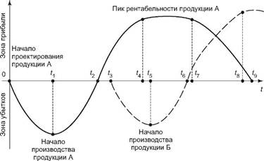 Увеличение объема продаж сверх критического объема реализации приносит предприятию прибыль, объем реализации ниже критического приносит убытки. С помощью теории «точки безубыточности» рассчитывают «эффект операционного рычага». Это показатель соотношения изменения прибыли при изменении объема реализации. Эффект операционного рычага состоит в том, что любое изменение выручки от реализации вызывает непропорционально большее изменение прибыли. Действие данного эффекта связано с непропорциональным воздействием постоянных и переменных затрат на финансовый результат при изменении объема производства и реализации. Чем выше доля постоянных расходов в себестоимости продукции, тем сильнее воздействие операционного рычага. И наоборот, при росте объема продаж доля постоянных расходов в себестоимости падает и воздействие операционного рычага уменьшается. Теория «точки безубыточности» используется также при принятии решений об инвестициях в обновление производственной программы. Прибыль в рыночной экономике — движущая сила обновления как производственных фондов, так и выпускаемой продукции. Характерно проявление этой силы в концепции «жизненного цикла» продукции. Общеизвестно, что любая продукция проходит стадии жизненного цикла от ее проектирования, освоения, запуска в производство, серийного выпуска, в результате которого происходит насыщение рынка этим продуктом. По истечении времени продукция морально устаревает, либо не выдерживает конкурентной борьбы и под давлением снижающейся рентабельности выпуск ее сокращается или прекращается (рис. 4.2).