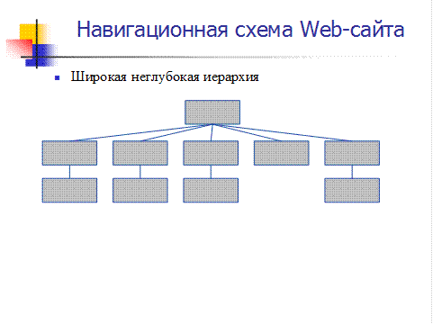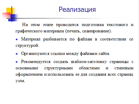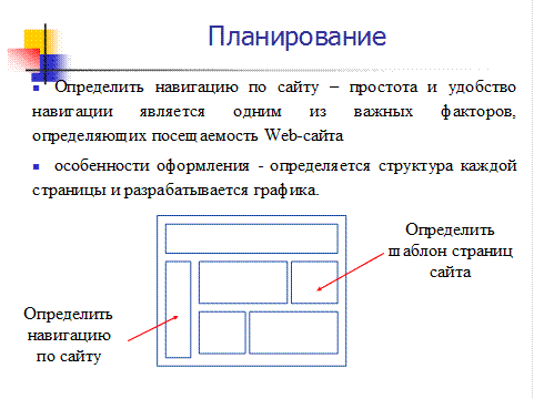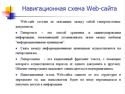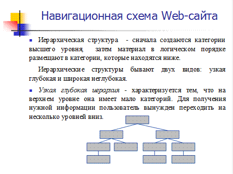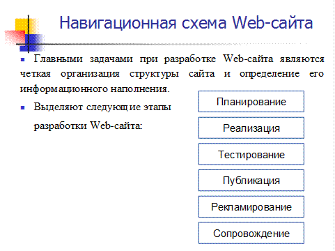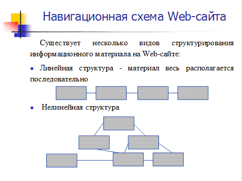 8) Развлекательно-игровой - в этом случае основа сайта строится на своего рода развлечениях, играх, музыке, опозновательно-развлекательной информации и т.д., где присутствует в основном красочное оформление, использование продвинутых технологий в стиле flash, всевозможной графики в ярких тонах (без фанатизма). Этапы создания сайтов: 1. Планирование 2. Реализайция. 3. Тестирование. 4. Публикация (хостинг) 5. Рекламирование 6. Сопровождение Лекция №2 (2 часа) 1. Этапы создания сайтов и содержание каждого из них. 2. Навигационная схема сайта Основная литература: [1, 5, 6, 13, 14, 16, 23, 32, 33] Дополнительная литература: [2, 17, 19, 50, 54, 62]