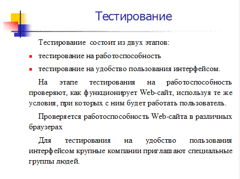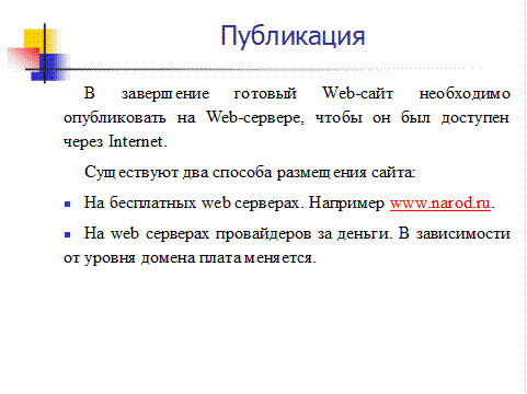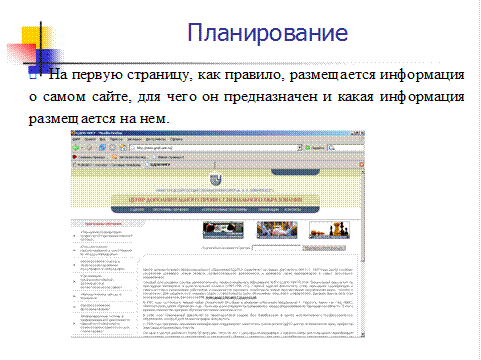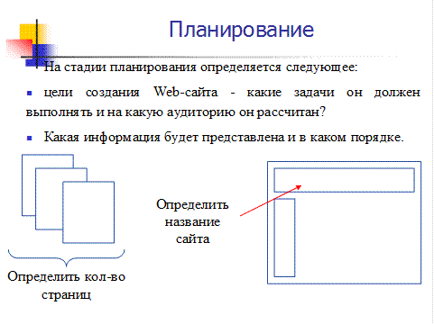 План Тема: Основные понятия сайтостроения. Этапы разработки сайтов. Первая классификация сайтов. Web-страница – это документ, содержащий текстовую, графическую и другие виды информации, написанный на специальном языке разметки гипертекста и просматриваемый специальной программой-броузером. Сайты делятся на две группы: динамические и статические Статические Web-страницы создаются вручную, потом сохраняются и загружаются на сайт. Всякий раз, когда требуется изменить содержимое такой страницы, пользователь модифицирует ее на своем рабочем компьютере, применяя, как правило, HTML-редактор, сохраняет ее и затем заново загружает на Web-сайт. Каждая отображаемая страница динамических Web-сайтов основана на шаблонной странице, в которую вставляется постоянно меняющееся информационное наполнение, которое обычно хранится в базе данных. Когда пользователь запрашивает страницу, соответствующая информация извлекается из базы, вставляется в шаблон, образуя новую Web-страницу, и пересылается Web-сервером в пользовательский браузер, который и отображает ее должным образом. Кроме информационного наполнения, динамически могут создаваться также и элементы навигации по Web-сайту. Таким образом, если вам нужно обновить содержимое своего сайта, вы просто добавляете текст для новой страницы, который затем вставляется в базу данных с помощью определенного механизма. В результате получается, что Web-сайт как бы сам себя обновляет. Вторая классификация сайтов. Сложность и тип Web-сайта находятся в прямой зависимости от предстоящих задач, возлагаемых на этот ресурс. По этому критерию Web-сайты можно условно классифицировать по следующим типам: