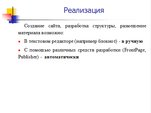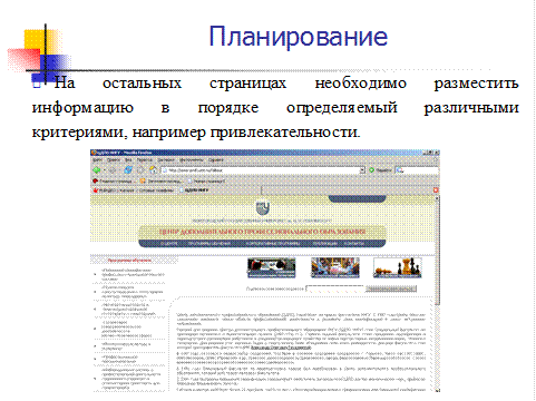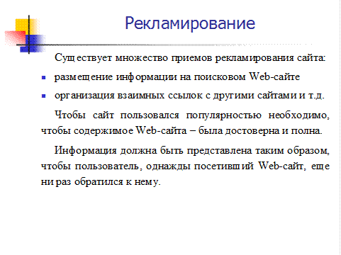 3) Корпоративные сайты - главная цель формирование у посетителя образа фирмы. Большинство таких сайтов рассчитаны на однократное посещение, поэтому корпорации вынуждены подходить к дизайну с особой тщательностью, чтобы произвести нужное впечатление с первого взгляда. Такие сайты могут содержать информацию не только о фирме, но и о ее продукте. Информация о продукции должна обновляться сравнительно часто. Двойная рекламно - информационная функция сайта смягчает требования к дизайну и ужесточает требования к полноте и качеству информации.