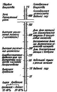 При увеличении температуры древесины до 120 °С в верхних слоях опилок наблюдалось образование капелек конденсирующей воды. При достижении температуры порядка 185 °С окраска опилок изменялась и наблюдался едва различимый "тонкий" туман. По оценке исследователей, этот туман обладал резким запахом, но едва ли мог называться дымом. Впервые настоящий дым появлялся в интервале температур 220—300 °С. Отмеченное дымообразование продолжалось до температуры 500 °С, и опилки полностью обугливались. В зоне горения образование дыма не наблюдалось. Здесь наблюдалось горение древесного угля, утратившего способность выделять газ. Дым появлялся рядом с зоной горения в еще не горящей, но достаточно разогретой древесине. Многочисленные исследования влияния температуры пиролиза древесины на химический состав дыма позволили заключить, что максимальный выход таких химических веществ, как фенолы, кислоты и карбонильные соединения, приходится на температуры 550-650 °С. При более высоких температурах генерирования, так же как и при более низких, содержание фенолов, кислот и карбонильных соединений в дыме заметно сокращается. Заданную (оптимальную для данных условий) температуру при получении тепла для разложения древесины за счет горения обеспечивают, как правило, путем изменения подачи воздуха в зону горения. С увеличением подачи воздуха температура в зоне пиролиза древесины возражает, и наоборот, ограничение подачи воздуха приводит к снижению температуры. Проще и точнее регулируется температура получения дыма, а значит, и его химический состав при использовании для разогрева внешнего источника тепла. В этом случае температура поддерживается и регулируется приборами автоматики. Примерами, когда тепло, необходимое для пиролиза, вырабатывается не в результате сгорания древесного угля, а подается снаружи, могут служить нагрев перегретым паром или с применением теплоты трения. На практике нашли применение два подобных дымогенератора, а именно фрикционный и паровой. Фрикционный работает при температуре пиролиза около 380 °С, паровой — от 320 до 380 °С. Образование дыма происходит при применении одного и другого способов в нижнем диапазоне температур, необходимых для пиролиза лигнина. При этих температурах лигнин является источником для образования ароматизирующих составляющих дыма, например фенолов, и распадается полностью. Многолетней практикой производства копченой рыбопродукции предпочтение при генерировании дыма отдано древесине лиственных пород деревьев. Готовая продукция при обработке в дыме из этой древесины имеет высокие качественные показатели, в частности приятный вкус и аромат копчености. Данный факт, несомненно, связан с химическим составом применяемого дыма, его кондиционностью. Установлено, что в дыме, образуемом при сжигании древесины из лиственных пород дерева (дуб, бук), содержание летучих кислот значительно выше, чем в дыме, генерируемом из хвойной древесины. Существует различие в структуре лигнина в древесине мягких и твердых пород. Основными компонентами фенольных соединений в коптильном дыме из мягкой древесины является гваякол, из твердой древесины — смесь гваяколов, сирингола и его парасоставляющих производных. Отсюда и значительные различия в ароматизирующем эффекте этих двух типов дыма. В дыме из хвойных по