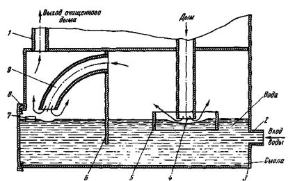 Рис. 53. Очистительное устройство дымогенератора Н-10-ИД2Г-1; 1 — выход очищенного дыма; 2 — штуцер для подсоединения к водопроводной сети; 3 — дно устройства; 4 — центральная труба; 5 - круговая стенка; 6 — перегородка, разделяющая устройство на два отсека; 7 - сливной лоток; 8 - люк; 9 - коленообразный патрубок Количество выбрасываемых в атмосферу органических соединений достигает при холодном копчении 2 г/м3, а при горячем копчении 10 г/м3. В настоящее время для очистки дымовых и газовых выбросов промышленных предприятий применяют способы адсорбции, абсорбции, высокотемпературного и каталитического сжигания, жидкофазного окисления, электростатического осаждения и комбинированные методы. С целью предупреждения загрязнения окружающего воздуха выбросами коптильных производств чаще всего применяют и рекомендуют применять такие способы, как осаждение дисперсной фазы выбросов в электростатическом поле высокого напряжения, каталитического и высокотемпературного сжигания. Существенное значение при оценке эффективности того или иного способа очистки является помимо стоимости устройств и их надежности в работе возможность возникновения побочных явлений, эксплуатационные расходы. Дожигание дымовых выбросов является наиболее эффективным способом обезвреживания, при котором достигается высокая степень очистки от токсичных веществ. Процесс может проходить при темпера туре около 500 °С (каталитическое дожигание) или 750 °С (термическое дожигание), в результате образуются водяной пар и углекислота. В качестве топлива в устройствах дожига используют обычный мазут или газ. Следует учитывать, что при использовании мазута в качестве топлива образуется двуокись серы. Если установки применяются для сжигания дыма сравнительно небольшой густоты (плотности), то количество образовавшейся двуокиси серы может быть выше, чем количество сжигаемого органического углерода. К тому же в настоящее время применение этих методов очистки становится экономически невыгодным из-за высокого потребления энергии (топлива) устройствами дожига. Метод становится экономичным, если для дожига использовать топки действующих тепловых агрегатов, например котлов. Однако термическое обезвреживание затрудняется наличием в отбрасываемых газах смоляных веществ. Скопление смолы нарушает аэродинамику дымоходов, работу регулировочных и горелочных устройств. На рис. 54 показана установка термического обезвреживания коптильных выбросов, содержащих смолу. Дымовые выбросы от коптильных печей 1 и системы вытяжной вентиляции 2 проходят через емкость предварительного отделения смолы 3, уменьшая отклонение смолы в вентиляторе 4. Газоход 5 служит одновременно и конденсатором и прокладывается с учетом в сторону смолосборника 10. Затем дымовые газы подаются дутьевым вентилятором 6 в воздушный тракт газомазутной горелки 7, устроенной в топке котла. Отделенная смола периодически подогревается змеевиком 9 для снижения вязкости мазута, который насосом 8 подается в жидкостный тракт газомазутной горелки для сжигания по аналогии с жидким топливом.