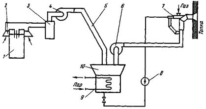 Рис. 54. Установка термического обезвреживания отработанных газов: I - коптильная печь; 2 - всасывающие каналы системы вытяжной вентиляции; 3 - вместимость предварительного отделения смолы; 4 — вентилятор; 5 — газоход; б - вентилятор подачи газов к горелке; 7 — газомазутная горелка; 8 — мазутный насос; 9 — система подогрева смолы; 10 — смолосборник