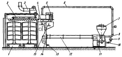 1 — коптильная камера; 2 — душевая система; 3 — выход отработанного воздуха; 4 и 15 - клапаны регулирования температуры и влажности рабочей среды; 5 — вентилятор циркуляции рабочей среды; 6 — воздуховод подачи воздуха в ды-могенератор; 7 - дымогенератор; 8 - подача воздуха в зону горения дымогене ратора; 9 — дроссельная заслонка; 10 — подача воздуха в обход зоны горения опилок; 11 — электрический поджиг опилок; 12 — подача дыма в камеру; 13 — сток конденсата; 14 — система подогрева рабочей среды