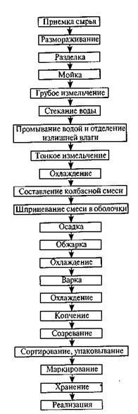 Производство рыбных копченых колбас имеет специфические особенности по сравнению с производством мясных, главные из которых — высокие лиофильность белков и окисляемость жиров, а также зависимость структурообразующей способности мышечных тканей рыбы от ее вида. Вкусовые качества копченой колбасы определяются исходным составом колбасной смеси, технологическими режимами обработки, особенно копчения. В процессе копчения колбасная смесь не только насыщается коптильными компонентами для улучшения вкусовых качеств, но и формируется структура из разрозненных составляющих в виде монолита. В последние годы вылов традиционных видов рыб (судака, леща, щуки, трески, лососевых, осетровых) сократился, появились новые объекты промысла, считающиеся по некоторым показателям сырьем с пониженной товарной ценностью (ставрида, путассу, хек, минтай и др.)- Они малопригодны для копчения, вяления, приготовления столовых блюд, однако имеют в своем составе все биологически активные вещества, незаменимые амино- и жирные кислоты. Исследования показали, что из таких видов рыб целесообразно выпускать колбасные копченые изделия, добиваясь путем введения пищевых, ароматических и других добавок характерных вкусовых качеств, а также гигиеничности и стойкости продуктов при хранении. К преимуществам производства рыбных копченых колбас относятся: возможность использования многих промысловых видов рыб; возможность изменения вкуса и пищевой ценности в результате использования смеси нескольких видов рыб и разного соотношения сырья, вкусовых добавок и специй; высокая биологическая ценность, так как изделия богаты белками, жирами, минеральными веществами; относительно высокие гигиеничность и стойкость при хранении за счет применения антисептиков и герметичных оболочек; возможность производства в любое время года. В копченых рыбных колбасах по сравнению с рыбными и мясными изделиями содержится большое количество белковых веществ (30—35 %), жира (15—23 %), они имеют более длительный срок хранения (до 3 мес). Сырье и материалы для производства колбас. Пищевое сырье: мороженая рыба или мороженые фарши, рыба-сырец, рыба охлажденная (ставрида, хек, путассу, минтай, акула, морской окунь, марлин и др.), некоторые нерыбные объекты (кальмар и его гонады, каракатицы и ее гонады и др.), жиры наземных животных (шпик, баранье сало и др.). Пищевые материалы: вкусовые добавки, жиры, яйца, крахмал, молоко, пряности, чеснок, лук, коптильные препараты, пищевые красители, соль, фосфаты, вода, нитриты, майонез и др. При выборе сырья следует отдавать предпочтение нежирным видам рыб, так как их мышечные ткани обладают высокой эластичностью. Однако для мышечных тканей некоторых видов нежирных рыб (треска, минтай) характерна низкая эластичность. Сырье после измельчения должно приобретать определенные структурно-механические свойства, т. е. липкость и адгезионность, придающие ему способность к формованию. В противном случае структура готовой колбасы не приобретает целостности, она будет рыхлой и разваливающейся на разрезе. Наилучшими эластичностью, липкостью и адгезионностью обладают мышечные ткани молодой и отнерестившийся рыбы, а также свежей рыбы сразу после вылова. Целесообразно использовать следующее сырье: черный и голубой марлины, особый мороженый фарш из минтая, акулы, го