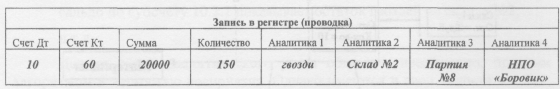 Рассмотренные выше схемы организации аналитического учета были непосредственно связаны со счетами синтетического учета. Однако, если учесть, что все итоговые значения хранятся не в разрезе плана счетов, а в разрезе регистра учета (журнала проводок), что было рассмотрено выше, можно сделать вывод о том, что в рамках программы «1С:Предприятие 8» можно реализовать и пооперационную аналитику, то есть аналитику, привязанную к записи в регистре (проводке). Данная схема аналитического учета характеризуется тем, что у счетов нет аналитических субсчетов или привязки к объектам аналитического учета. В проводке указываются только синтетические счета, однако имеется возможность ко всей проводке добавить определенные объекты аналитического учета, актуальные для всей проводки. Так, например, аналитический учет по счету 10 «Материалы» стандартно ведется в разрезе материалов и мест хранения, а по счету 60 «Расчеты с поставщиками и подрядчиками» в разрезе контрагентов и договоров. Применение пооперационной аналитики позволяет обойти ограничения по используемым объектам аналитики. В операции поступления материалов от поставщика можно указать только синтетические счета 10 и 60, а аналитические объекты (материалы, место хранения, контрагента, договор и пр.) можно указать в целом для всей проводки. В дальнейшем, при анализе счета будет происходить отбор соответствующих проводок, и группировка по определенным объектам аналитики. Таким образом, автоматически организуется аналитический учет по счету 10 в разрезе, например, контрагентов, и наоборот, по счету 60, в разрезе материалов, поступивших от контрагента. Недостатком подобного рода аналитического учета следует признать сложность получения итоговых данных (приходится перебирать все записи), а также «лишняя» аналитика по синтетическим счетам.