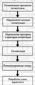 Накопленный к настоящему времени практический опыт позволяет выявить, по меньшей мере, три эффекта сегментации: максимизации прибыли, обманчивости величины и игнорированного сегмента. Эффект максимизации прибыли на единицу продукции заключается в увеличении доходов предприятия в результате обоснованного выбора целевого сегмента, что обусловливается уменьшением издержек на распространение и продвижение товара. Такой эффект позволяет фирме с небольшими ресурсами эффективно конкурировать с фирмами больших размеров на специализированных рынках. Эффект обманчивости величины свидетельствует о том, что наибольшая величина сегмента не всегда соответствует наилучшим коммерческим возможностям, т.к. в большом по величине сегменте вполне вероятны сильная конкуренция и высокая степень удовлетворенности потребителей. Эффект игнорированного сегмента заключается в том, что наиболее успешный бизнес может развиваться именно в игнорированном другими фирмами сегменте рынка. Выявление игнорированного сегмента может выступать первоочередной задачей любой процедуры сегментации, т.к. позволяет занять на рынке соответствующую рыночную нишу. Указанные эффекты обманчивости величины и игнорированного сегмента позволяют целенаправленно выявить наиболее предпочтительные сегменты целевого рынка для конкретного товара. Непосредственно процесс сегментации распадается на шесть этапов (см. рис. 1). Начинать процесс следует с подбора принципов сегментации. Наиболее часто встречаются на практике следующие пять принципов: различия между сегментами, сходства потребителей, большой величины сегмента, измеримости характеристик потребителей, достижимости потребителей. Принцип различия между сегментами означает, что в результате проведения сегментации должны быть получены различающиеся друг с другом группы потребителей, иначе сегментация будет подменена массовым маркетингом. Принцип сходства потребителей в сегменте предусматривает однородность потенциальных покупателей с точки зрения покупательского отношения к конкретному товару. Требование большой величины сегмента означает, что целевые сегменты должны быть достаточно большими для обеспечения продаж и покрытия издержек предприятия. При оценке величины сегмента следует учитывать характер продаваемого товара и емкость потенциального рынка. Измеримость характеристик потребителей необходима для целенаправленных полевых маркетинговых исследований, в результате которых можно выявлять потребности потенциальных покупателей, а также изучать реакцию целевого рынка на маркетинговые действия предприятия. Данный принцип крайне важен, т.к. распространение товара «вслепую», без обратной связи от потребителей, ведет к распылению средств, трудовых и интеллектуальных ресурсов фирмы-продавца. Принцип достижимости потребителей означает требование наличия каналов коммуникации фирмы-продавца с потенциальными потребителями. Такими каналами коммуникации могут быть газеты, журналы, радио, телевидение, средства наружной рекламы и т.п. Достижимость потребителей необходима для организации акций продвижения.