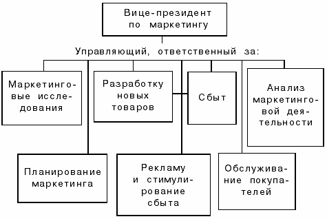 В данной и ряде последующих оргструктур маркетинговые службы возглавляет вице-президент по маркетингу. Однако на практике статус маркетинговых служб в системе управления предприятием может быть разным. Поэтому маркетинговые службы может возглавлять и директор по маркетингу, и начальник отдела маркетинга, и другое административное лицо.)
