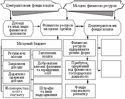 Місцеві фінансові ресурси — це сукупність фондів грошових засобів, які створюються в процесі розподілу та перерозподілу ВВП і спрямовуються на економічний та соціальний розвиток адміністративно-територіальних одиниць. Головним напрямом використання місцевих фінансових ресурсів є фінансове забезпечення соціальної сфери та місцевого господарства. До складу місцевих фінансових ресурсів входять: · місцеві бюджети; · фінансові ресурси підприємств, організацій та установ комунальної форми власності. · Формування місцевих фінансових ресурсів відбувається з участю централізованих та децентралізованих фондів грошових засобів. Структурно-логічну схему фінансових ресурсів регіонів наведено в схемі 3. Особливості формування доходів місцевих бюджетів полягають у розмежуванні кола повноважень між центральними та місцевими органами влади. Згідно з чинним законодавством сфери діяльності та завдання органів місцевого самоврядування поділяються на власні та делеговані повноваження. З метою виконання власних завдань органи місцевого самоврядування в межах своєї компетенції самостійно визначають мінімальний обсяг фінансових ресурсів.