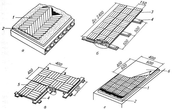 Рисунок – Паркетные полы: а – штучные; б – из паркетных досок; в – щитовые; г – мозаичные; 1 – паркетная клепка; 2 – цементная стяжка; 3 – паркетные доски; 4 – лаги; 5 - паркетные щиты; 6 – паркетные карты