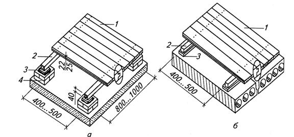 Рисунок – Дощатые полы: а – на грунте; б – на перекрытии; 1 – шпунтовые доски; 2 – лаги; 3 – упругие прокладки; 4 – кирпичные столбики По геометрическому решению крыши могут быть односкатными, двухскатными, четырехскатными (вальмовыми), многоскатными или другой формы (рис.).