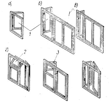 Рисунок – Типы окон: а – одностворчатые; б – трехстворчатые с равными створками; в – то же, с неравными створками; г – двустворчатые; 1 – открывающаяся створка; 2 - фрамуга; 3 – форточка