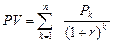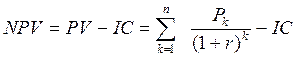 Чистый приведенный доход NPV (net present value) Метод расчета чистого приведенного дохода основан на сопоставлении величины исходной инвестиции IC с общей суммой дисконтированных чистых денежных поступлений PV, генерируемых ею в течение прогнозируемого срока n. Т.к. приток денежных средств распределен во времени, он дисконтируется по ставке r, установленной инвестором. Пусть делается прогноз, что инвестиция IC будет генерировать в течение n лет годовые доходы P1, P2,…, Pn.
