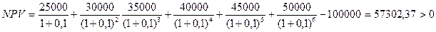 Типовые примеры на расчет показателя чистого приведенного дохода Пример1: Фирма собирается вложить средства в приобретение нового оборудования, стоимость которого вместе с доставкой и установкой составит 100 000 ден. ед. Ожидается, что внедрение оборудования обеспечит получение на протяжении 6 лет чистых доходов в 25 000, 30 000, 35 000, 40 000, 45 000, и 50 000 ден. ед. соответственно. Принятая норма дисконта равна 10%. Определить экономическую эффективность проекта.