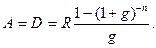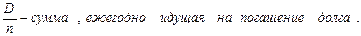 Из общей суммы расходов должника часть выделяется на уплату процентов, остаток идет на погашение основного долга. Периодическая выплата постоянной суммы Y = R равнозначна ренте с заданными параметрами. Ее современная стоимость A = сумме долга D, т.е.