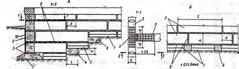 Стеновые блоки с замкнутыми пустотами изготавливают для фундаментов внутренних стен и для наружных в маловлажных грунтах. Для сокращения расхода материала, уменьшения затрат труда и полного использования несущей способности грунтов фундаменты можно укладывать с раздвижкой, величиной от 0.2-0.9 м.