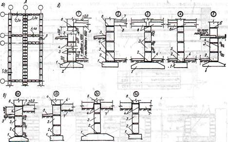 Рис.8.3. Сборные ленточные фундаменты из бетонных блоков: а - монтажная схема с маркировкой сечений; б- детали сечений фундаментов под стены зданий с подвалами и техническими подпольями; в - детали сечений фундаментов под стены зданий без подвалов и технических подполий; 1 -фундаментная плита; 2 - цементно-песчаный раствор; 3 - бетонные стеновые блоки; 4 - окраска горячим битумом за два раза; 5 -отмостка; 6 - два слоя толя или гидроизола на битумной мастике; 7 - конструкция пола; 8 - цокольное перекрытие
