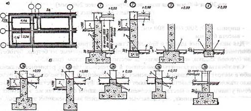 Монолитные ленточные фундаменты: а - схема плана фундамента с маркировкой сечений; б -детали сечений фундаментов под стены зданий с подвалами и техническими подпольями; в - то же под стены зданий без подвалов и технических подполий; 1 - окраска горячим битумом за два раза; 2 - отмостка; 3 - два слоя толя или гидроизола на битумной мастике; 4 - цокольное перекрытие; 5 - конструкция пола по грунту.