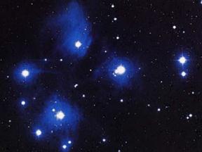 Рассеянные звездные скопления встречаются вблизи галактической плоскости. Всего известно более 1500 таких объектов в радиусе нескольких килопарсеков от Солнца. Наиболее известны рассеянное звездное скопление Плеяды (рис. 6.2), удаленное от нас на расстояние 120 пс, и Гиады, которое находится в сорока пяти парсеках от нас. Чтобы отделить звезды, принадлежащие скоплению, от звезд поля, случайно проектирующихся в ту же область неба, можно построить диаграмму спектр-светимость. Для скоплений обычно строят диаграмму цвет-видимая звездная величина, откладывая по осям показатель цвета (вместо спектрального класса) и видимую звездную величину, которая одинаково для всех звезд скопления отличается от абсолютной.
