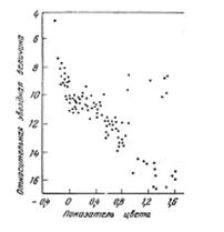 На диаграмме спектр-светимость для рассеянных скоплений, как правило, хорошо заметна главная последовательность. Ветвь гигантов в большинстве случаев отсутствует или почти отсутствует. Поскольку все звезды скопления практически находятся на одинаковом расстоянии, его диаграмма цвет-видимая звездная величина (рис. 6.4) отличается от обычной сдвигом по вертикальной оси на величину модуля расстояния, а из-за влияния межзвездного поглощения света (см.§ 6.4), и по горизонтальной оси. Ясно, что звезды, не попадающие на “свои” места на диаграмме, могут не принадлежать скоплению. Проверить принадлежность этих звезд скоплению можно, изучив их собственные движения и лучевые скорости. Если звезды относятся к одному и тому же скоплению, то собственные движения всех звезд должны пересекаться в одной точке — радианте скопления. Тогда, зная угол q между направлением на звезду скопления и на радиант, а также лучевую скорость звезды vr и ее собственное движение m, можно найти расстояние до звезды (в парсеках), а, значит, и до скопления: