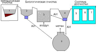 Рисунок 16. - Принципиальная схема очистных сооружений: 1 - пескоуловители; 2 - первичные отстойники; 3 - аэротенк; 4 - вторичные отстойники; 5 - биологические пруды; 6 - осветление; 7 - реагентная обработка; 8 - метатенк; АИ - активный ил