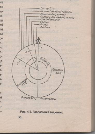 Рис.4.1. Геологічний годинник (Стратиграфічний метод вивчає послідовность напластувань і склад шарів і ті, які лежать нижче давніших за тих, що лежать вище від них.) А б со л ю т н а система літочислення встановлює вік напластувань г.п. в абсолютних одиницях: в роках, тисячоліттях і т. д., при цьому використовують радіоактивний метод, оснований на природному розпаді ядер нестійких ізотопів (наприклад, радіоактивних елементів) перетворюючи їх в стійкі ізотопи або нові хімічні елементи.