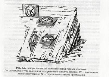 Замер элементов залегания пласта Характеристики залегания пласта Положение пласта в пространстве определяется азимутами простирания и падения, а также (истинным) углом падения. Азимутом простирания является азимут любой горизонтальной линии, лежащей в плоскости пласта Азимут падения – азимут линии пересечения вертикальной плоскости, проходящей через линию наибольшего уклона пласта (ската воды) с горизонтальной плоскостью, проходящей через линию простирания. Азимуты падения и простирания отличаются на 90 градусов Угол падения образуется линией наибольшего уклона пласта – линией падения и ее проекцией на горизонтальную плоскость. Ориентировка с помощью горного компаса Осуществляется горным компасом · Азимут простирания замеряется при ориентировке боковой стороны компаса параллельно линии простирания и соответственно направлении 0 шкалы по простиранию · Азимут падения замеряется при ориентировке компаса 0 шкалы (северным торцом компаса) в сторону падения пласта. · Угол падения замеряется по угломеру (эклиметру) компаса, при ориентировке боковой грани параллельно линии падения пласта