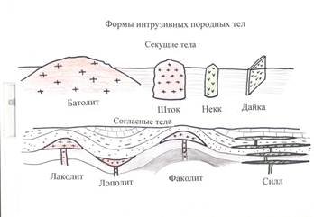 Могут быть секущими (несогласными) или пластовыми – согласными. Выделяют несогласые тела: Батолиты огромные тела площадью более 100 кв.км Штоки – столбообразные тела площадью менее 100 кв. км. Некки – трубообразные тела с диаметром в десятки и менее метров Дайки – уплощенные вертикальные тела небольшой толщины и значительно большей протяженности Апофизы – ответвления от основных тел.