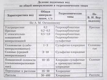 определяется отношением свободно вытекающей из породы воды к ее объему. Наибольшей водоотдачей обладают наиболее грубообломочные породы (например, галечники и гравелиты). Вода находится в горных породах в различном состоянии. Легко извлекается «свободная вода». Она находится в капельно-жидком состоянии, твердом или в парообразном и подчиняется силам гравитации, либо это вода капиллярная, удерживаемая в тонких каналах силой поверхностного натяжения. Кроме свободной воды в горных породах находится физически связанная –(гигроскопическая), которая удаляется только при нагревании до температуры более 100 градусов С) и пленочная (находится поверх гигроскопической в виде пленки многомолекулярной и способной к медленному перемещению между зернами с разной ее толщиной). Основными признаками, положенными в основу классификации подземных вод, являются их химический состав и условия залегания По химическому составу подземные воды подразделяются на классы: (гидрокарбонатные, сульфатные и хлоридные - по радикалу соответствую-щих кислот). Классы, в свою очередь, делятся на группы в зависимости от присутствия одного из катионов (кальция, магния, натрия). Химический состав воды определяет ее название. Например, гидрокарбонатнокальциевая, сульфатномагниевая и т.п. Группы подразделяются на типы I, II, III в зависимости от соотношений компонентов. Полная запись химического типа воды (например, гидрокарбонатнокальциевой II) выглядит так – С Са II. Кроме этой основной классификации по химическому составу различают воды щелочные (содержащие HCO3), жесткие (Сa и Mg) и соленые (Cl и SO4).