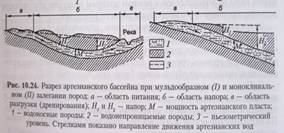 По условиям залегания и гидравлическим свойствам различают воды: 1-верховодку, 2-грунтовые, 3-межпластовые безнапорные и 4 -напорные (артезианские). Верховодка залегает на первом водоупорном не выдержанном по простиранию горизонте и обычно находится в зоне аэрации на глубине до 1, реже 3-х метров. Ее уровень значительно колеблется в зависимости от погоды и обычно сильно загрязнена.