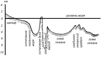 На основании изучения рельефа и геофизических материалов в океанах выделяются два основных типа структур: океанические платформы – талласократоны (греч. «таляса» – море) и вулканические подвижные пояса. Океанические платформы занимают большую часть площади океана. Они разделяются валообразными сводово-глыбовыми поднятиями на отдельные впадины. Такие валы и впадины в какой-то степени могут быть сопоставлены с антеклизами и синеклизами материковых платформ. На океанической платформе Тихого океана обнаружены зоны широтных глубинных разломов (Г. Менард). Внутриокеанические подвижные пояса выражены срединными хребтами, система которых пересекает все океаны. Наиболее изучен Срединно-Атлантический хребет, склоны которого осложнены сбросовыми нарушениями, создающими ступенчатый рельеф, а в середине располагается глубокая (до 2 км) впадина, представляющая собой грабен (рифтовая долина), образовавшийся по глубинным разломам. В ряде случаев в осевой полосе хребтов наблюдается чередование горстов и грабенов. В рельефе дна океанов выделяется несколько крупных ступеней (см.рис.).