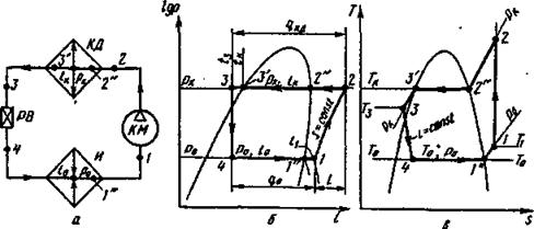 Принципиальная схема одноступенчатой аммиачной холодильной машины показана на рис 2, а, ее теоретический цикл (обратный круговой процесс) в i, lgp-диаграмме — на рис. 2, б и в s, Т-диаграмме — на рис. 2, в. Рис. 2. Принципиальная схема (а) н цикл на i, lgp-диаграмме (б) и s, T-диаграмме (в) одноступенчатой аммиачной холодильной машины: КМ — компрессор; КД — конденсатор; И — испаритель; РВ — регулирующий вентиль