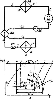 Рис. 3. Принципиальная схема (а) и цикл на 1. i, lgp-диаграмме (б) одноступенчатой фреоновой холодильной машины с регенеративным теплообменником и компрессором, имеющим встроенный электродвигатель: КМ — компрессор; ЭД — встроенный электродвигатель; КД — конденсатор; И —испаритель; РТО — регенеративный теплообменник