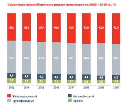 Структура грузооборота транспорта в России в 2003-2010 г. (годовой отчет ОАО «РЖД» за 2010 г., Росстат). Услуги железнодорожного транспорта – одна из ключевых составляющих транспортного рынка России.