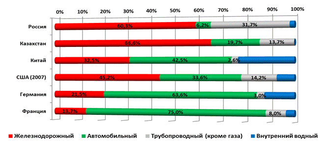 Доли видов транспорта в объемах грузооборота различных стран в 2008 г. (за вычетом воздушного и морского транспорта; Росстат.