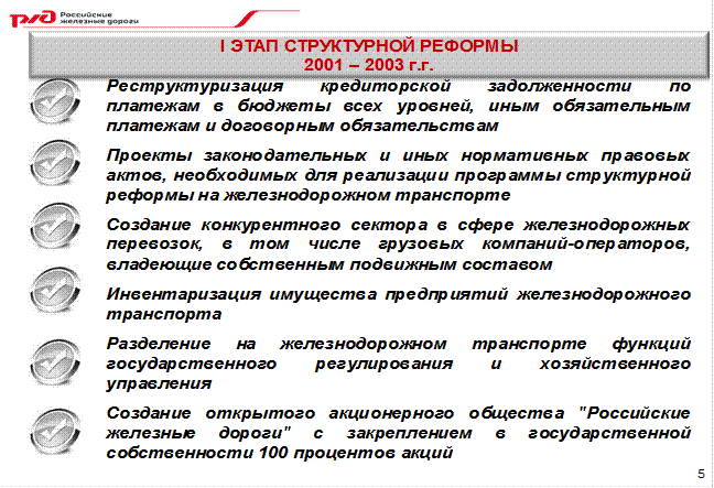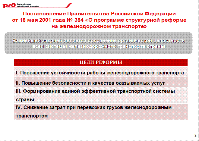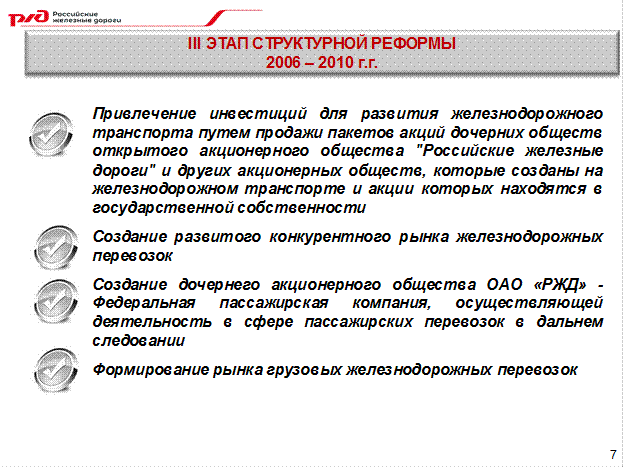 С самого начала реформаторам требовалось разрешить главные вопросы: - являются ли железные дороги в России естественной монополией или нет, возможно, ли их поделить, в какой части их сделать коммерческими? Известный министр финансов России граф Витте (который до этого возглавлял Министерство путей сообщения и провел реформу железнодорожных тарифов) считал, что железные дороги в России должны быть государственными (велика социальная значимость, перед коммерческой и экономической выгодой). Большинство современным специалистов считают, что российское пространство из-за своей протяженности коммерчески неэффективно, поэтому в части инфраструктуры железные дороги должны оставаться естественной монополией, контролируемой государством. Однако поднимать эффективность деятельности железнодорожной монополии, повышать ее прозрачность, а также создавать механизм по привлечению в отрасль инвестиций возможно только через адаптацию ее к рыночным отношениям. - насколько «глубоко» можно приватизировать железную дорогу в России? - «скорость реформирования»? В России высока социальная роль железных дорог, которые остаются самым доступным видом транспорта для миллионов граждан. В России в обязанность перевозчика входит не только перевозить грузы, а делать это публично, равнодоступно по всей сети железных дорог, обеспечивая содержание необходимой инфраструктуры для выполнения специальных и воинских перевозок, и по тарифам, установленным государством.