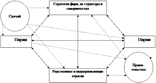 Рис.3.1. Детерминанты конкурентного преимущества страны ("национальный ромб") «Национальный ромб» выявляет систему детерминантов, которые, находясь во взаимодействии, создают благоприятную или неблагоприятную среду для реализации потенциальных конкурентных преимуществ страны. Каковы же эти «детерминанты»? Параметры факторов представляют собой материальные (вещественные) и нематериальные условия, необходимые для формирования конкурентного преимущества страны в целом и ее ведущих экспортно-ориентированных отраслей. Рассматривая факторы производства с точки зрения их влияния на конкурентные преимущества страны, М. Портер наряду с традиционными факторами (труд, земля, капитал, предпринимательская способность) выделяет и такие факторы, как ресурс знаний, т. е. сумма научной, технической и рыночной информации, влияющей на конкурентоспособность товаров и услуг, а также инфраструктуру (транспортная система, система связи, почтовые услуги, система здравоохранения, обеспеченность населения жилым фондом и др.). Важное значение в теории М. Портера уделяется делению факторов на общие (например, сеть автомобильных дорог, персонал с высшим образованием и др.), которые создают конкурентные преимущества для широкого спектра отраслей, и специализированные (например, персонал с узкой специализацией, база данных в определенной области знаний и т.д.), которые, как правило, применимы в ограниченном числе отраслей или даже в одной-единственной отрасли. При этом специализированные факторы, обеспечивая более длительное и устойчивое конкурентное преимущество фирмам соответствующих отраслей на мировом рынке, в то же время требуют значительных и долговременных капиталовложений. Стратегия фирм, их структура и соперничество. В обеспечении национального конкурентного преимущества немаловажную роль играет фирменная структура и конкурентная среда внутри страны, которая складывается в результате соперничества фирм. Если отсутствует конкурентная среда или соперничество между фирмами, если стратегия фирмы не ориентирована на деятельность в условиях соперничества, то на внешнем рынке у таких фирм конкурентного преимущества обычно не возникает. Параметры спроса - это, в первую очередь, емкость спроса, динамика его развития, дифференциация спроса на виды продукта, требовательность покупателей к качеству товаров и услуг. Именно на внутреннем рынке в условиях развитого спроса должны получать апробацию новые изделия до выхода их на мировой рынок. Родственные и поддерживающие отрасли. Наличие в национальной экономике высоко развитых родственных и поддерживающих отраслей, обеспечивающих фирмы в экспортно-ориентированных отраслях необходимыми материалами, полуфабрикатами, комплектующими изделиями и другими материальными средствами и информацией, выступает необходимым условием создания и поддержания конкурентного преимущества в мировой торговле для фирм соответствующих отраслей. В общую систему детерминантов конкурентных преимуществ М. Портер включает и роль случайных событий, которые могут либо усилить, либо ослабить сложившиеся конкурентные преимущества страны. Случайными являются события, которые имеют мало общего с условиями развития экономики страны и влиять на которые часто не могут ни фирмы, ни правительство. К наиболее 