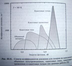 Рис. Спектр коэффициентов усиления для лазеров на идеальных, объемных полупроводниках, квантовых ямах, квантовых проволоках и квантовых точках.