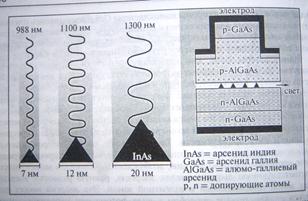 Рис Схема устройства лазера с краевым излучением на самоорганизованных квантовых точках. На вставке показан зародышевый слой с пирамидальными квантовыми точками.