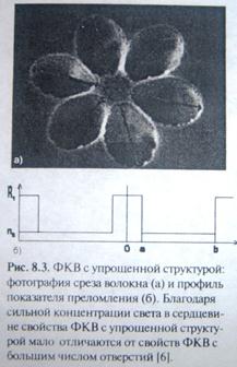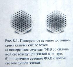 Создание оптического волокна на основе кварцевого стекла позволило системам магистральной связи снять ограничения на скорость передачи и ширину полосы пропускания. коэффициент затухания упал и сигнал стало возможным передавать на сотни километров без регенерации. В настоящее время ведутся поиски новых перспективных волокон в том числе фотонно-кристаллических. Фотонно-кристаллическое волокна (ФКВ) - это волокна, оболочка которых представляет двумерный Основной особенностью ФКВ является распространение энергии световой волны вдоль линейного дефекта (сердцевины волокна). Сама волна существует виде поперечной одной основной электрической моды ТЕ01 или магнитной моды ТМ01, т.е в поперечном сечении волокна или плоскости решетки фотонного кристалла. см игнатов 103с.