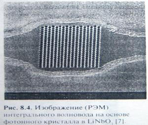 Созданы интегральные волноводы на основе фотонных кристаллов ниобата лития. На рис представлено изображение канального световода в кристалле ниобата лития. Он сформирован методом стандартной диффузии титана. В центральной части кристалла создан фотонный кристалл методом ионного травления. Диаметр отверстий 215 нм, период-413 нм. Данный световод обладает фотонной запрещенной зоной в интервале от 1200 нм до 1600 нм с коэффициентом экстинкции 12 дБ. Рис чап292